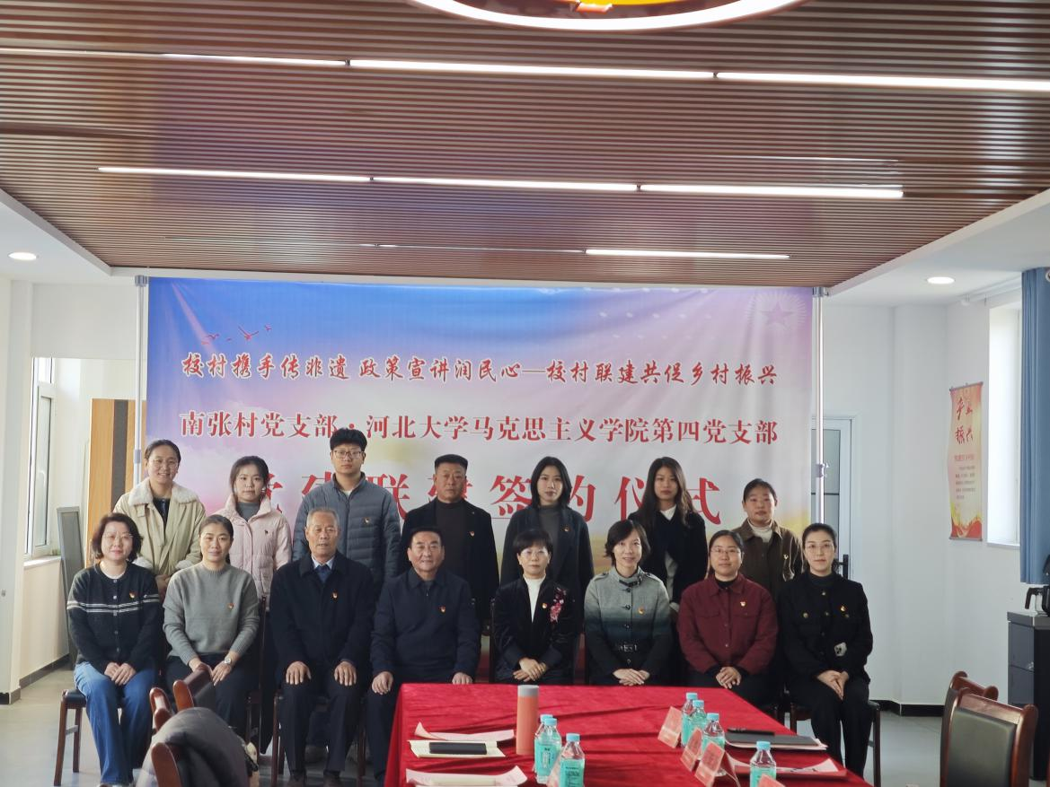 为深入贯彻党的二十大精神,推动校地党建资源共享、互学互鉴,11月20日上午,我院第四党支部与容城县南张镇南张村党支部联学联建签约仪式,在南张村党群服务中心二楼会议室举行。河北大学马克思主义学院第四党支部书记王华玲及全体支部成员,容城县县委常委、宣传部长陈丽,县委组织部副部长李硕,南张村 “两委” 成员,非遗“南张戳脚”传承人代表参加签约仪式。会议由容城县委宣传部副部长李爽主持。