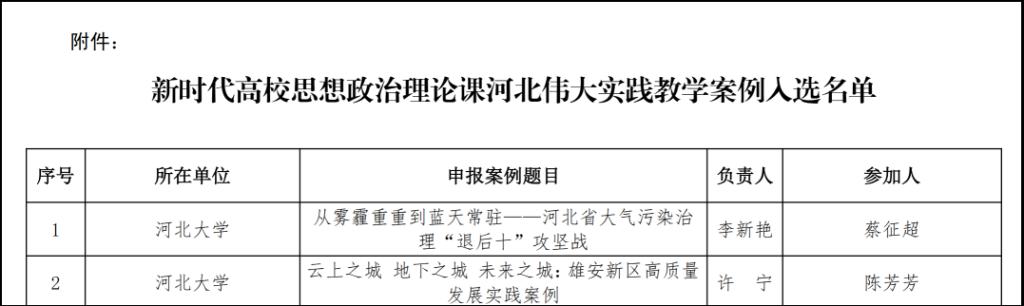 李新艳老师的教学案例《从雾霾重重到蓝天常驻——河北省大气污染治理“退后十”攻坚战》、许宁老师的教学案例《云上之城 地下之城 未来之城:雄安新区高质量发展实践案例》入选新时代高校思想政治理论课河北伟大实践优秀教学案例。
