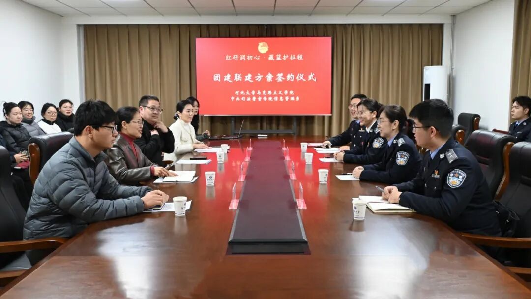 为深入贯彻党的二十届四中全会精神,贯彻落实习近平新时代中国特色社会主义思想,深化高校共青团改革,2025年12月12日,我院与中央司法警官学院信息管理系“红研润初心・藏蓝护征程”团建联建签约仪式于河北大学奋学楼举行。河北大学团委书记白金、马克思主义学院党委书记郑艳菊,中央司法警官学院团委副书记郝艳杰、信息管理系党委书记刘文洋出席仪式,双方学院团委书记及师生代表30余人参加仪式,活动由河北大学马克思主义学院团委书记关惠肇主持。