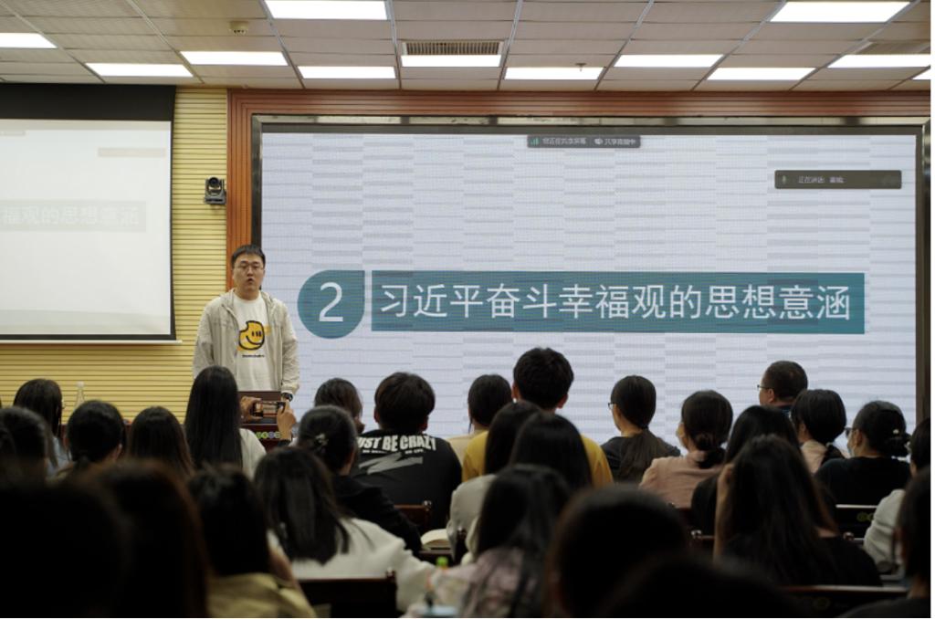 其次,柴素芳教授以《习近平奋斗幸福观的逻辑溯源、思想意蕴和时代价值》为主题做专题报告。柴教授从“什么是幸福?”这一问题切入主题与该院学生展开讨论,进而引出“奋斗幸福观”这一话题,从多角度探讨了奋斗和幸福之间的关系。柴教授聚焦党的二十大报告,从“习近平奋斗幸福观的逻辑溯源、思想内涵和时代价值”三重维度带领师生剖析了党的二十大报告,进一步认识了习近平奋斗幸福观。