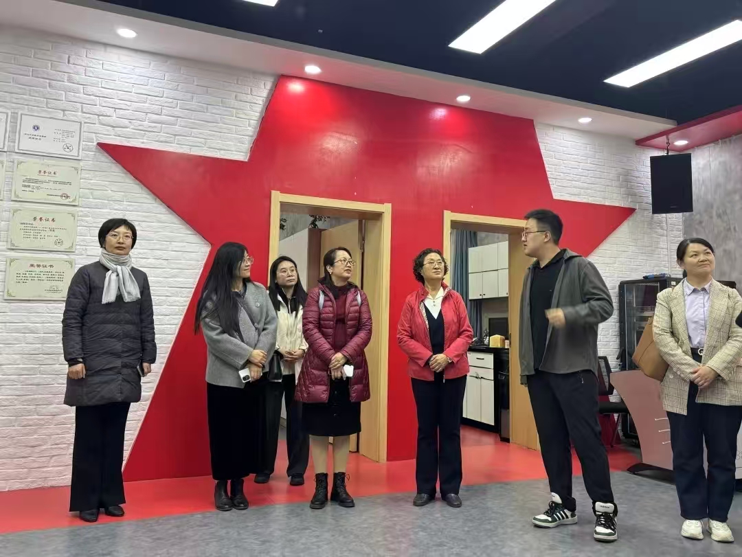 首先,“幸福微影社”首任社长姜旭博士带领韦教授等9人参观了“融媒体与新时代高校思政课微电影教学基地”成果展示室、微影创作室、全国名师工作室,详细介绍了“基地”的建设情况。